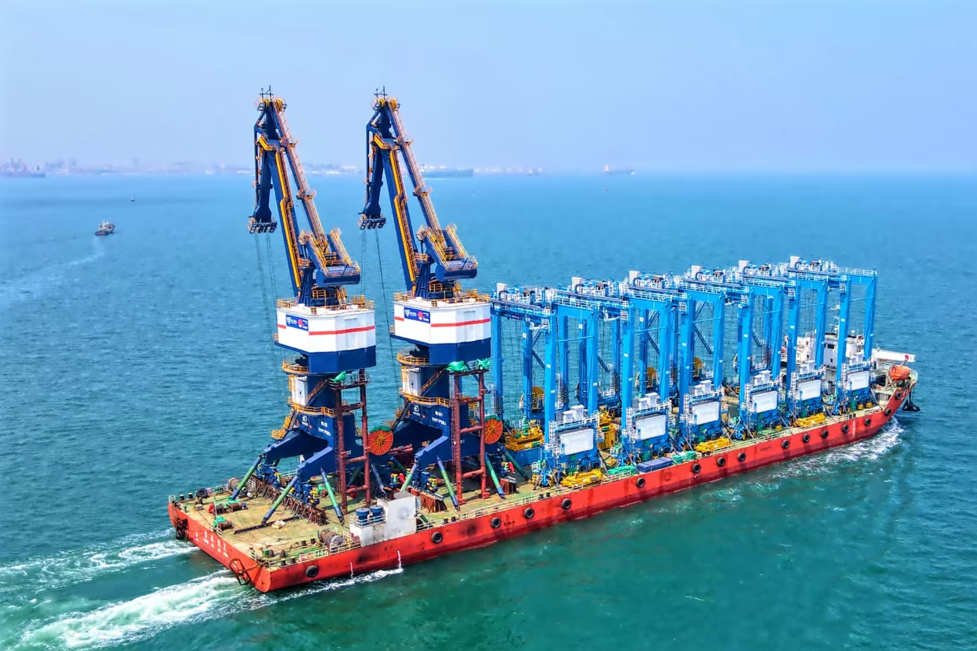 该批门机配有吊钩、抓斗、集装箱吊具,用于件杂货作业以及集装箱、抓斗作业,可满足5万吨级货船的装卸需求,将与前期武汉船机海西重机为其打造的批量岸桥协同作业。