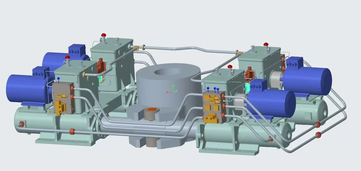 17000TEU双燃料集装箱船是绿色新能源船舶的典型代表,武汉船机为该船提供的舵机型号为FE42-1150-T050,最大工作扭矩可达11280kN·m,最大转舵角度为37度,单台舵机配备的四套动力系统为双柱塞四油缸拔叉式舵机结构,具有系统性集成度高、可靠性高、性能优等特点。